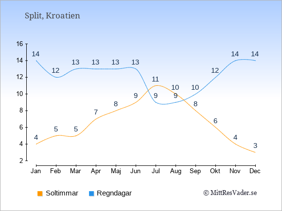 Grafen visar det genomsnittliga antalet soltimmar i Split under en viss månad (soltimmar är det antalet timmar per dag där solen skinnar), och antalet regndagar (dvs. det genomsnittliga antalet dagar