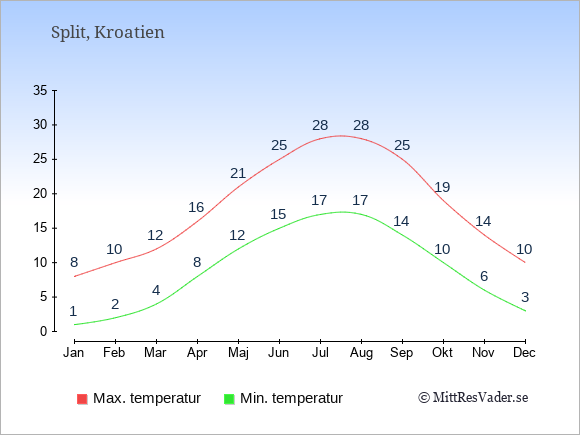 Grafen visar de genomsnittligt högsta temperaturerna i Split (vanligtvis det värde som uppmätts mitt på dagen) och de genomsnittligt lägsta temperaturer (vanligtvis tidpunkten just innan soluppgång).