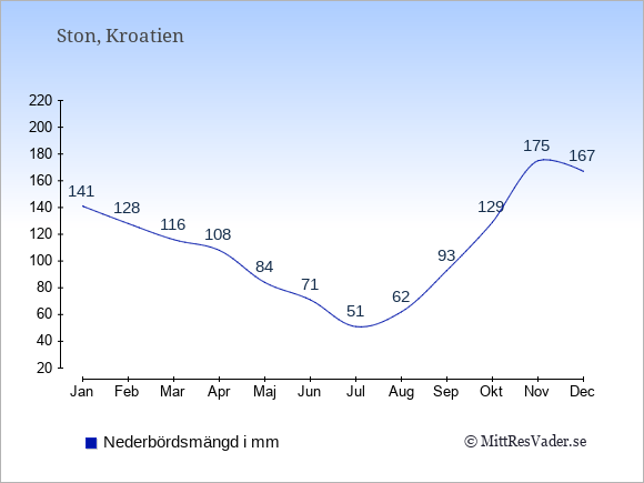 Få en överblick över vädret i Ston månad för månad med temperaturer, vattentemperatur, soltimmar och nederbörd.