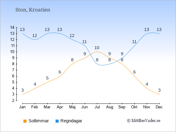 Grafen visar det genomsnittliga antalet soltimmar i Ston under en viss månad (soltimmar är det antalet timmar per dag där solen skinnar), och antalet regndagar (dvs. det genomsnittliga antalet dagar