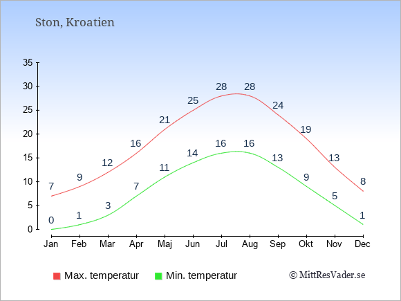 Grafen visar de genomsnittligt högsta temperaturerna i Ston (vanligtvis det värde som uppmätts mitt på dagen) och de genomsnittligt lägsta temperaturer (vanligtvis tidpunkten just innan soluppgång).