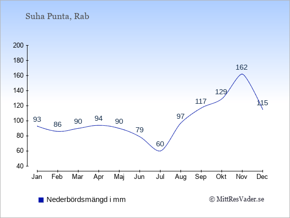 Grafen visar det genomsnittliga antalet soltimmar i Suha Punta under en viss månad (soltimmar är det antalet timmar per dag där solen skinnar), och antalet regndagar (dvs. det genomsnittliga antalet dagar