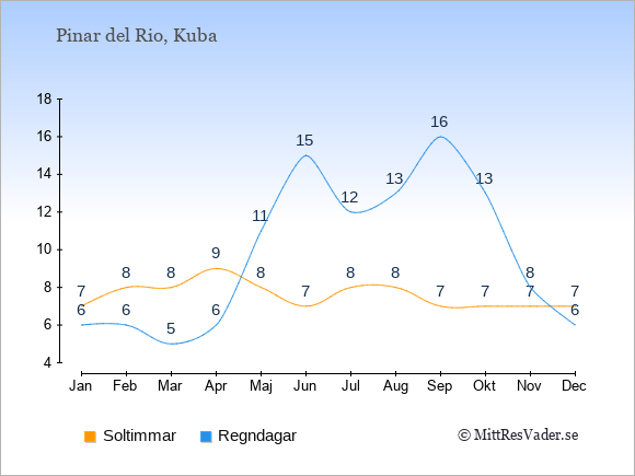 Graferna visar det genomsnittliga antalet soltimmar i Pinar del Rio per dag