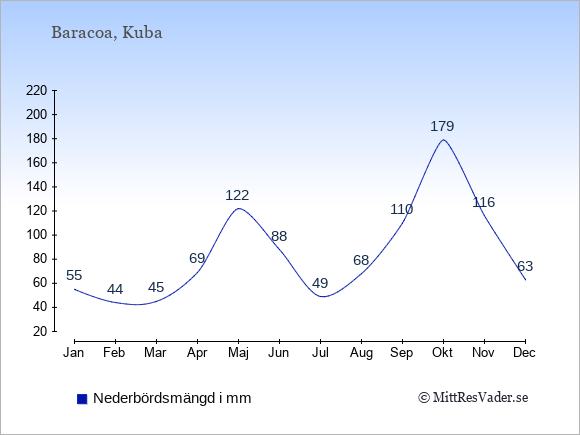 För att se hur vädret i Baracoa skiljer sig från vädret hemma, kan du också jämföra siffrorna måned för måned med motsvarande siffror för Sverige under samma period här: Baracoas klimat.