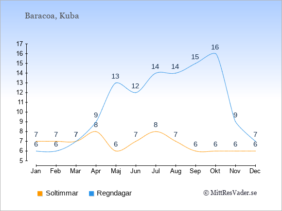Grafen visar det genomsnittliga antalet soltimmar i Baracoa under en viss månad (soltimmar är det antalet timmar per dag där solen skinnar), och antalet regndagar (dvs. det genomsnittliga antalet dagar