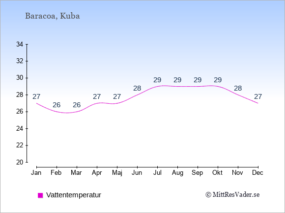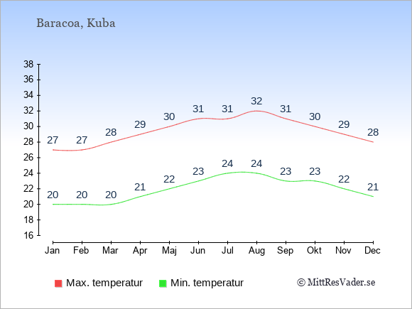 Grafen visar de genomsnittligt högsta temperaturerna i Baracoa (vanligtvis det värde som uppmätts mitt på dagen) och de genomsnittligt lägsta temperaturer (vanligtvis tidpunkten just innan soluppgång).