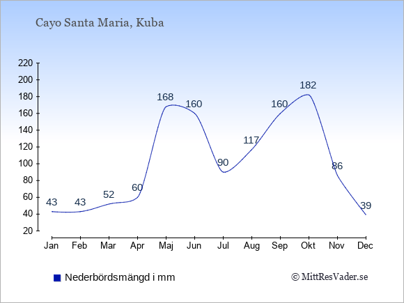 För att se hur vädret på Cayo Santa Maria skiljer sig från vädret hemma, kan du också jämföra siffrorna måned för måned med motsvarande siffror för Sverige under samma period här: Cayo Santa Marias klimat.