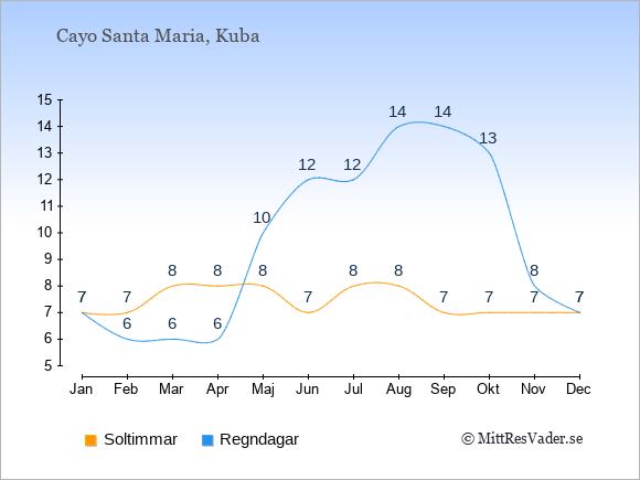Grafen visar det genomsnittliga antalet soltimmar på Cayo Santa Maria under en viss månad (soltimmar är det antalet timmar per dag där solen skinnar), och antalet regndagar (dvs. det genomsnittliga antalet dagar