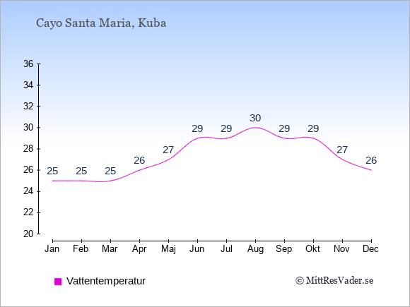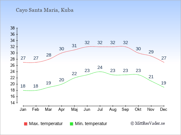 Grafen visar de genomsnittligt högsta temperaturerna på Cayo Santa Maria (vanligtvis det värde som uppmätts mitt på dagen) och de genomsnittligt lägsta temperaturer (vanligtvis tidpunkten just innan soluppgång).