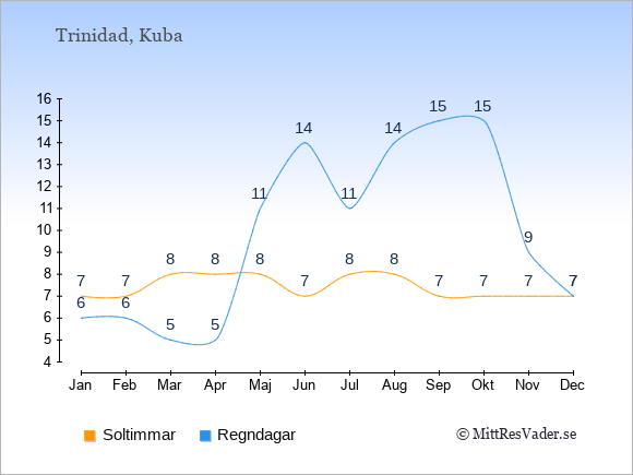 Grafen visar det genomsnittliga antalet soltimmar i Trinidad under en viss månad (soltimmar är det antalet timmar per dag där solen skinnar), och antalet regndagar (dvs. det genomsnittliga antalet dagar