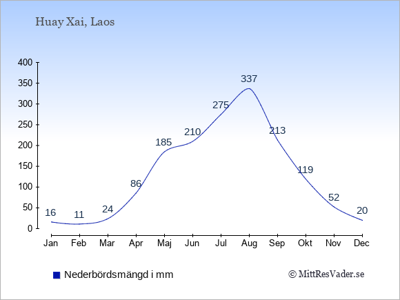 För att se hur vädret i Huay Xai skiljer sig från vädret hemma, kan du också jämföra siffrorna måned för måned med motsvarande siffror för Sverige under samma period här: Huay Xais klimat.