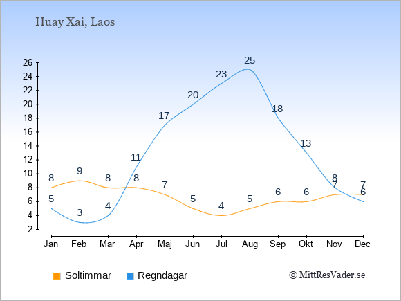 Grafen visar det genomsnittliga antalet soltimmar i Huay Xai under en viss månad (soltimmar är det antalet timmar per dag där solen skinnar), och antalet regndagar (dvs. det genomsnittliga antalet dagar
