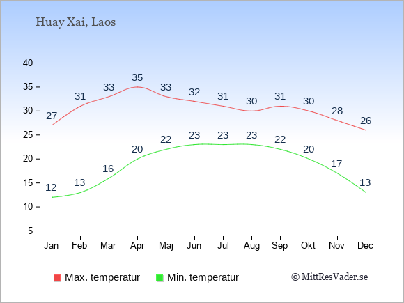 Grafen visar de genomsnittligt högsta temperaturerna i Huay Xai (vanligtvis det värde som uppmätts mitt på dagen) och de genomsnittligt lägsta temperaturer (vanligtvis tidpunkten just innan soluppgång).