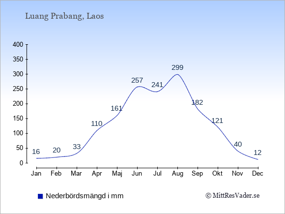 För att se hur vädret i Luang Prabang skiljer sig från vädret hemma, kan du också jämföra siffrorna måned för måned med motsvarande siffror för Sverige under samma period här: Luang Prabangs klimat.