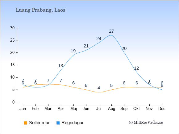 Grafen visar det genomsnittliga antalet soltimmar i Luang Prabang under en viss månad (soltimmar är det antalet timmar per dag där solen skinnar), och antalet regndagar (dvs. det genomsnittliga antalet dagar