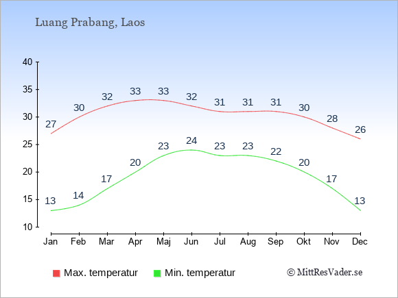 Grafen visar de genomsnittligt högsta temperaturerna i Luang Prabang (vanligtvis det värde som uppmätts mitt på dagen) och de genomsnittligt lägsta temperaturer (vanligtvis tidpunkten just innan soluppgång).
