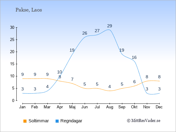 Grafen visar det genomsnittliga antalet soltimmar i Pakse under en viss månad (soltimmar är det antalet timmar per dag där solen skinnar), och antalet regndagar (dvs. det genomsnittliga antalet dagar