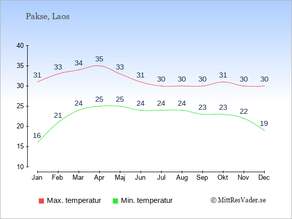 Grafen visar de genomsnittligt högsta temperaturerna i Pakse (vanligtvis det värde som uppmätts mitt på dagen) och de genomsnittligt lägsta temperaturer (vanligtvis tidpunkten just innan soluppgång).