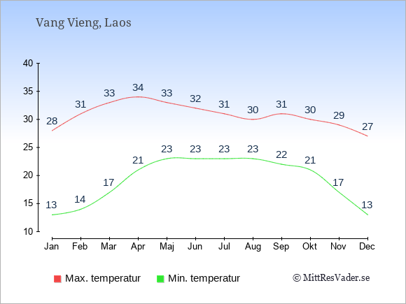 Grafen visar de genomsnittligt högsta temperaturerna i Vang Vieng (vanligtvis det värde som uppmätts mitt på dagen) och de genomsnittligt lägsta temperaturer (vanligtvis tidpunkten just innan soluppgång).