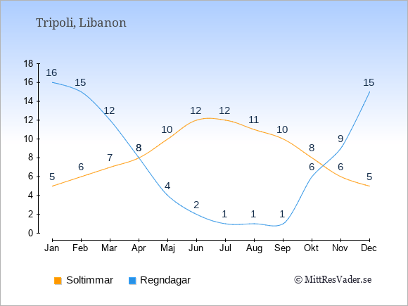 Grafen visar det genomsnittliga antalet soltimmar i Tripoli under en viss månad (soltimmar är det antalet timmar per dag där solen skinnar), och antalet regndagar (dvs. det genomsnittliga antalet dagar