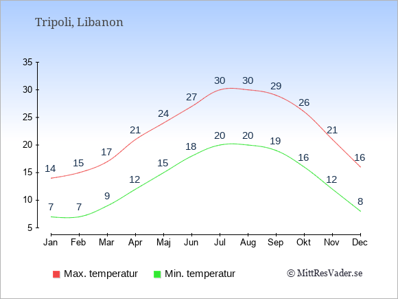 Grafen visar de genomsnittligt högsta temperaturerna i Tripoli (vanligtvis det värde som uppmätts mitt på dagen) och de genomsnittligt lägsta temperaturer (vanligtvis tidpunkten just innan soluppgång).
