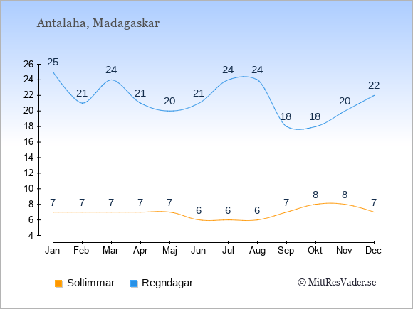 Grafen visar det genomsnittliga antalet soltimmar i Antalaha under en viss månad (soltimmar är det antalet timmar per dag där solen skinnar), och antalet regndagar (dvs. det genomsnittliga antalet dagar