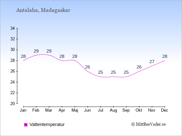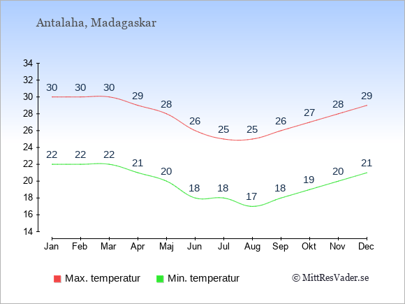 Grafen visar de genomsnittligt högsta temperaturerna i Antalaha (vanligtvis det värde som uppmätts mitt på dagen) och de genomsnittligt lägsta temperaturer (vanligtvis tidpunkten just innan soluppgång).
