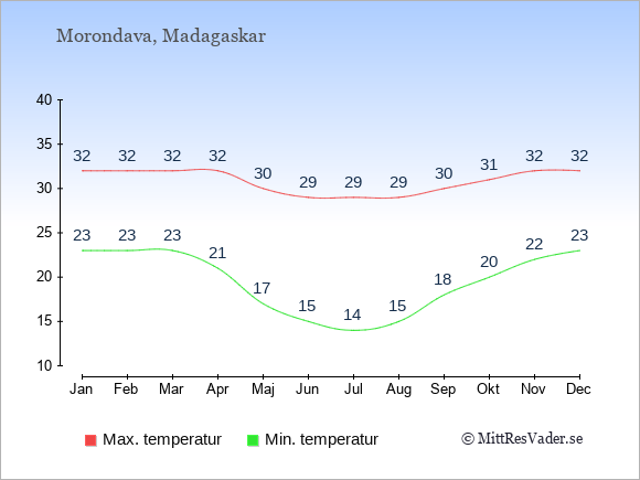 Grafen visar de genomsnittligt högsta temperaturerna i Morondava (vanligtvis det värde som uppmätts mitt på dagen) och de genomsnittligt lägsta temperaturer (vanligtvis tidpunkten just innan soluppgång).