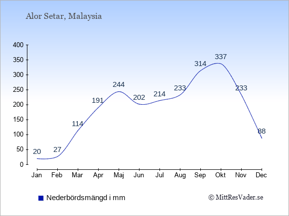 För att se hur vädret i Alor Setar skiljer sig från vädret hemma, kan du också jämföra siffrorna måned för måned med motsvarande siffror för Sverige under samma period här: Alor Setars klimat.
