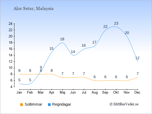 Grafen visar det genomsnittliga antalet soltimmar i Alor Setar under en viss månad (soltimmar är det antalet timmar per dag där solen skinnar), och antalet regndagar (dvs. det genomsnittliga antalet dagar
