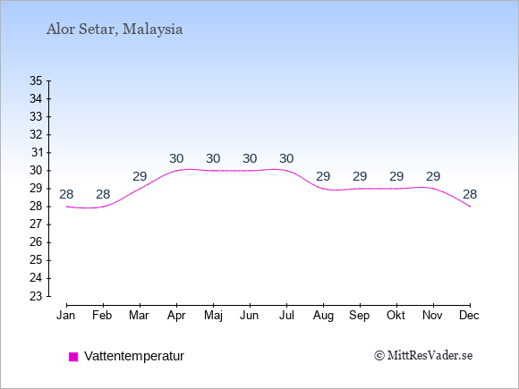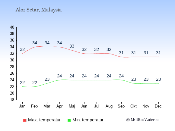 Grafen visar de genomsnittligt högsta temperaturerna i Alor Setar (vanligtvis det värde som uppmätts mitt på dagen) och de genomsnittligt lägsta temperaturer (vanligtvis tidpunkten just innan soluppgång).