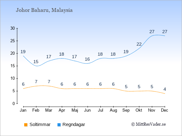 Grafen visar det genomsnittliga antalet soltimmar i Johor Baharu under en viss månad (soltimmar är det antalet timmar per dag där solen skinnar), och antalet regndagar (dvs. det genomsnittliga antalet dagar