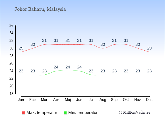 Grafen visar de genomsnittligt högsta temperaturerna i Johor Baharu (vanligtvis det värde som uppmätts mitt på dagen) och de genomsnittligt lägsta temperaturer (vanligtvis tidpunkten just innan soluppgång).