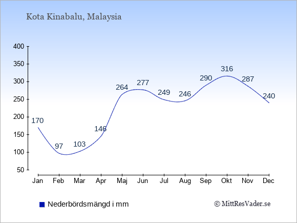 För att se hur vädret i Kota Kinabalu skiljer sig från vädret hemma, kan du också jämföra siffrorna måned för måned med motsvarande siffror för Sverige under samma period här: Kota Kinabalus klimat.