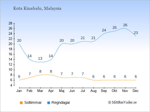 Grafen visar det genomsnittliga antalet soltimmar i Kota Kinabalu under en viss månad (soltimmar är det antalet timmar per dag där solen skinnar), och antalet regndagar (dvs. det genomsnittliga antalet dagar