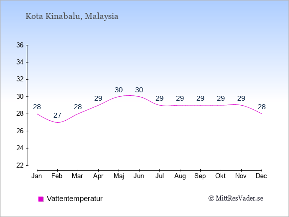 Grafen visar de genomsnittligt högsta temperaturerna i Kota Kinabalu (vanligtvis det värde som uppmätts mitt på dagen) och de genomsnittligt lägsta temperaturer (vanligtvis tidpunkten just innan soluppgång).