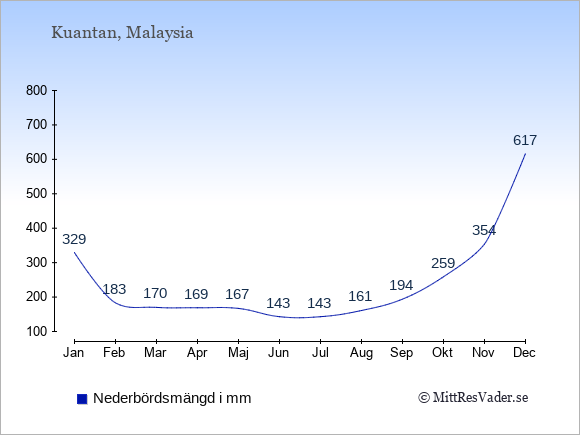 För att se hur vädret i Kuantan skiljer sig från vädret hemma, kan du också jämföra siffrorna måned för måned med motsvarande siffror för Sverige under samma period här: Kuantans klimat.