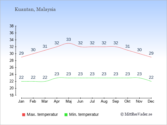 Grafen visar de genomsnittligt högsta temperaturerna i Kuantan (vanligtvis det värde som uppmätts mitt på dagen) och de genomsnittligt lägsta temperaturer (vanligtvis tidpunkten just innan soluppgång).