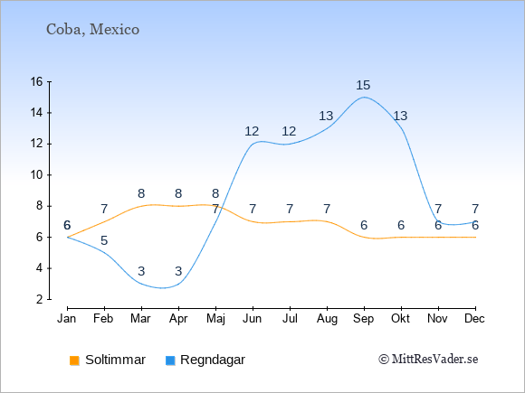 Grafen visar det genomsnittliga antalet soltimmar i Coba under en viss månad (soltimmar är det antalet timmar per dag där solen skinnar), och antalet regndagar (dvs. det genomsnittliga antalet dagar