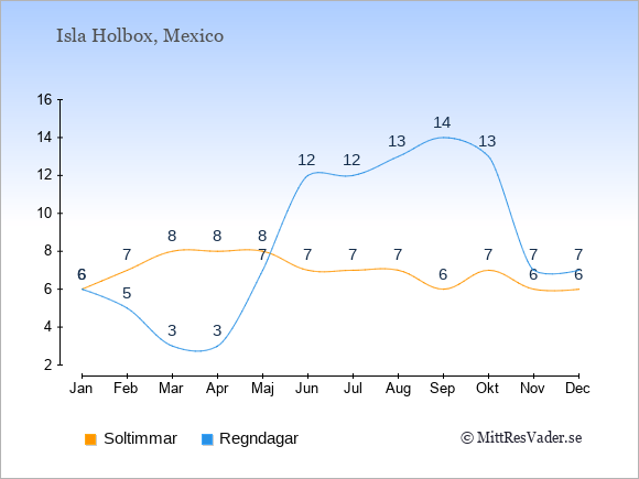 Grafen visar det genomsnittliga antalet soltimmar på Isla Holbox under en viss månad (soltimmar är det antalet timmar per dag där solen skinnar), och antalet regndagar (dvs. det genomsnittliga antalet dagar
