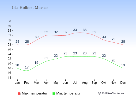 Grafen visar de genomsnittligt högsta temperaturerna på Isla Holbox (vanligtvis det värde som uppmätts mitt på dagen) och de genomsnittligt lägsta temperaturer (vanligtvis tidpunkten just innan soluppgång).