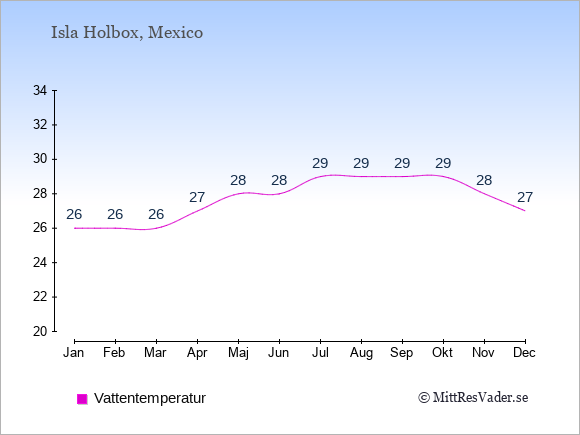 För att se hur vädret på Isla Holbox skiljer sig från vädret hemma, kan du också jämföra siffrorna måned för måned med motsvarande siffror för Sverige under samma period här: Isla Holbox klimat.