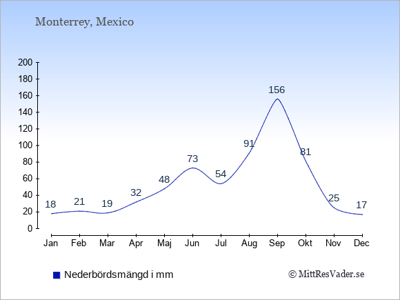 För att se hur vädret i Monterrey skiljer sig från vädret hemma, kan du också jämföra siffrorna måned för måned med motsvarande siffror för Sverige under samma period här: Monterreys klimat.