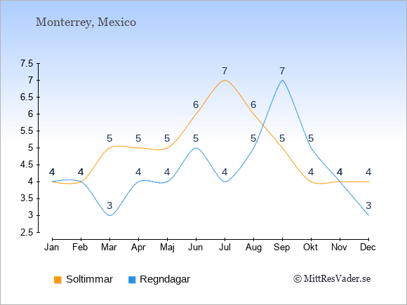 Grafen visar det genomsnittliga antalet soltimmar i Monterrey under en viss månad (soltimmar är det antalet timmar per dag där solen skinnar), och antalet regndagar (dvs. det genomsnittliga antalet dagar