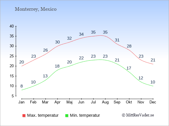 Grafen visar de genomsnittligt högsta temperaturerna i Monterrey (vanligtvis det värde som uppmätts mitt på dagen) och de genomsnittligt lägsta temperaturer (vanligtvis tidpunkten just innan soluppgång).