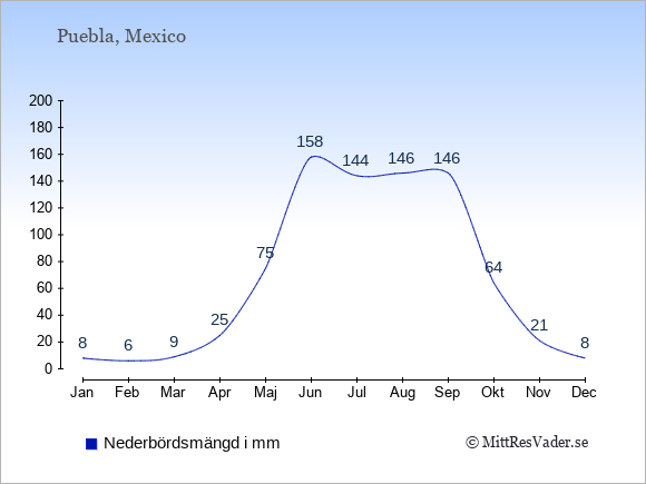 För att se hur vädret i Puebla skiljer sig från vädret hemma, kan du också jämföra siffrorna måned för måned med motsvarande siffror för Sverige under samma period här: Pueblas klimat.