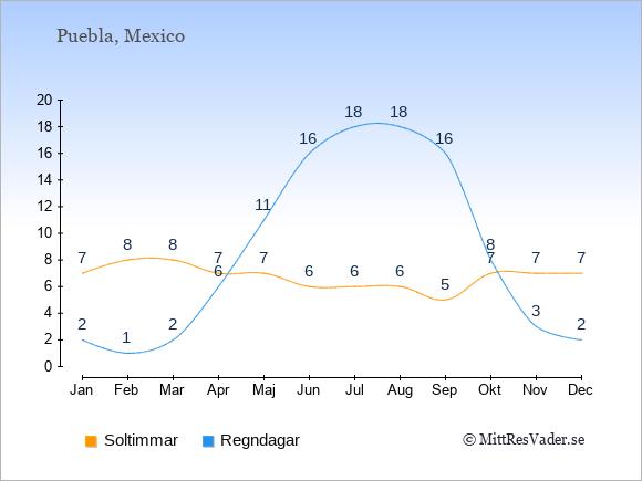 Grafen visar det genomsnittliga antalet soltimmar i Puebla under en viss månad (soltimmar är det antalet timmar per dag där solen skinnar), och antalet regndagar (dvs. det genomsnittliga antalet dagar