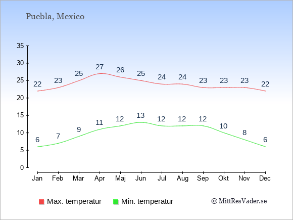 Grafen visar de genomsnittligt högsta temperaturerna i Puebla (vanligtvis det värde som uppmätts mitt på dagen) och de genomsnittligt lägsta temperaturer (vanligtvis tidpunkten just innan soluppgång).