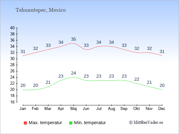 Grafen visar de genomsnittligt högsta temperaturerna i Tehuantepec (vanligtvis det värde som uppmätts mitt på dagen) och de genomsnittligt lägsta temperaturer (vanligtvis tidpunkten just innan soluppgång).