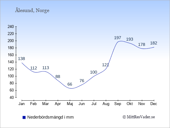 På denna sida kan du få en överblick över de statistiska klimatuppgifterna för Ålesund månad för månad jämfört med klimatet i Stockholm. Information om det historiska klimatet kan du använda för att planera din semester och hitta den bästa tiden att resa till Ålesund på.